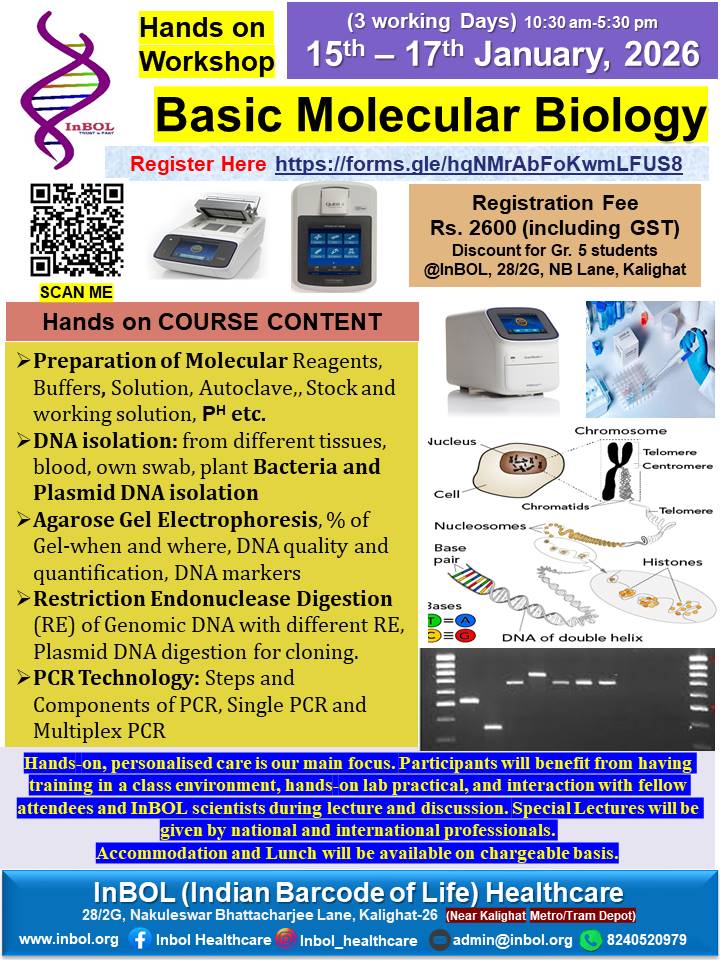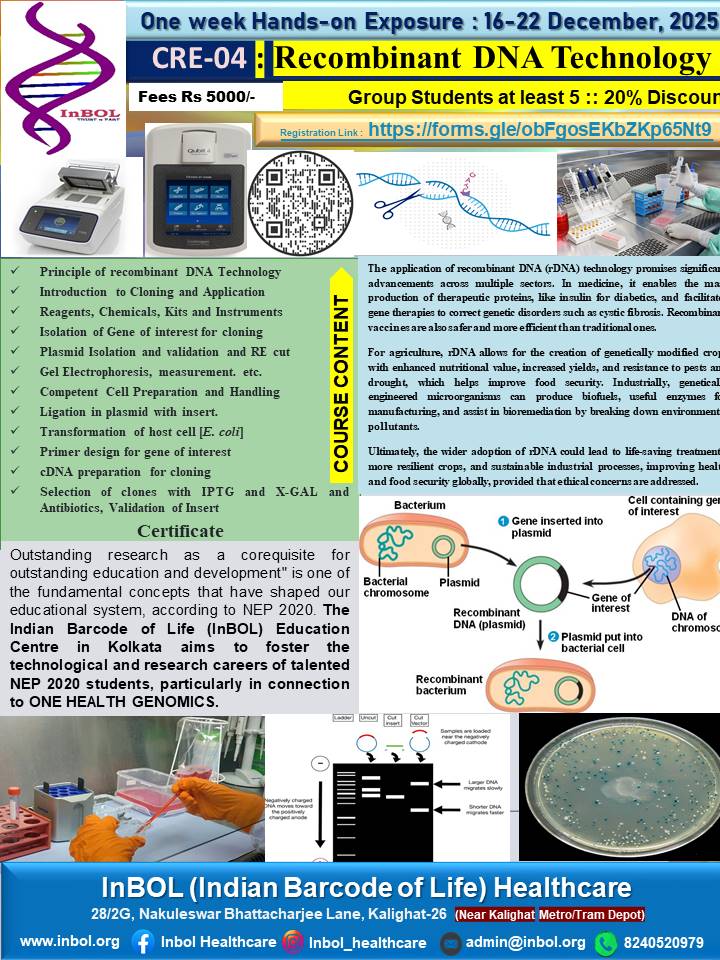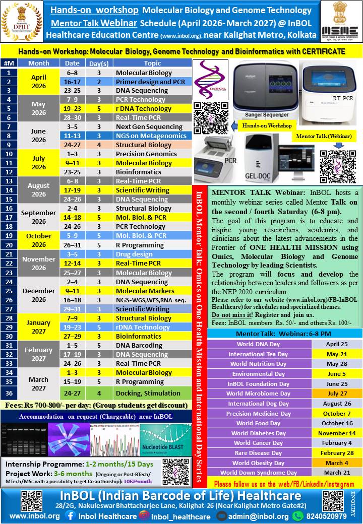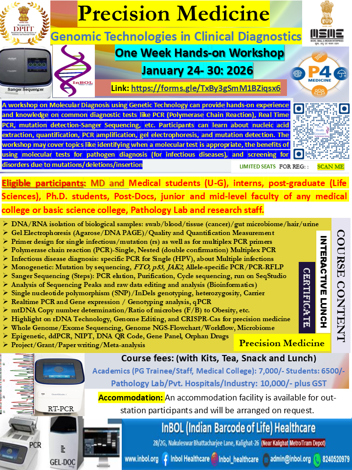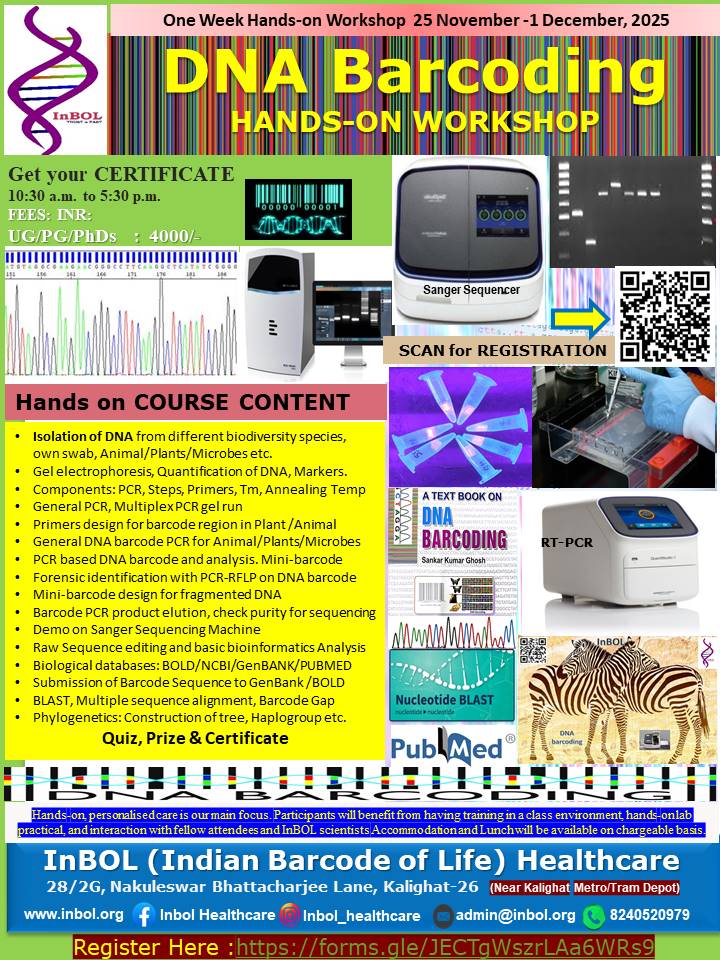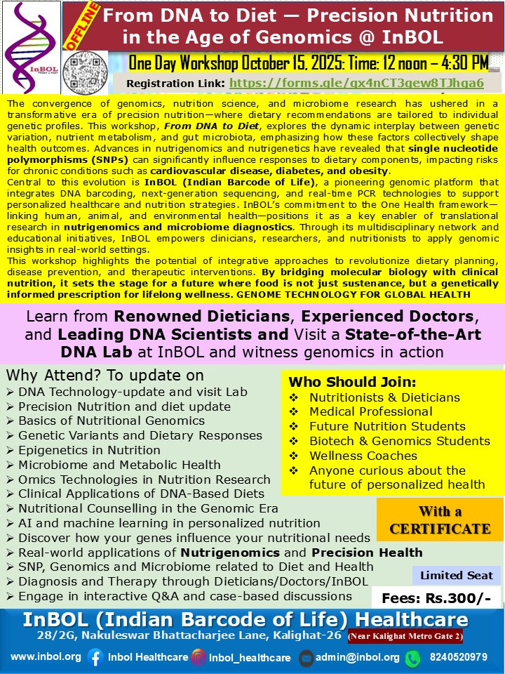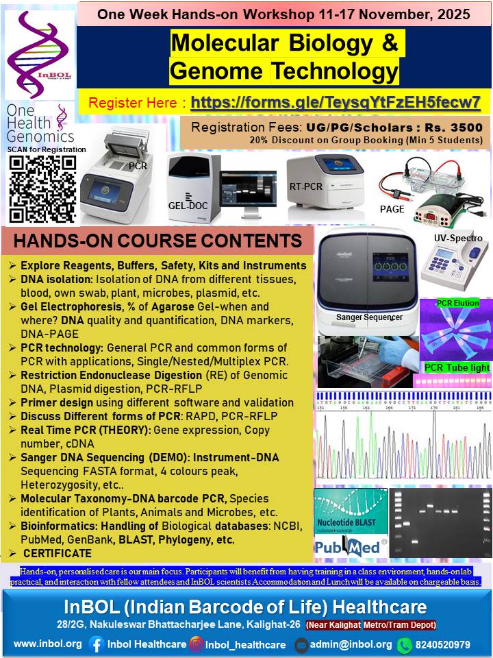 InBOL has since its inception focused on the A,T,G,C of life, dedicating its intellectual and state-of-the-art resources to one health genomics, precision medicine, drug repurposing, non-invasive parental testing, DNA QR code technology for food and bioresource safety and authentication research and developing real life application. With a clear translational vision InBOL aims to contribute in the fulfillment of One Health Mission.