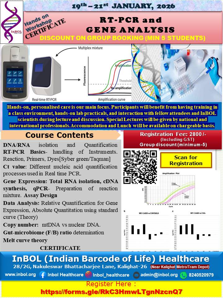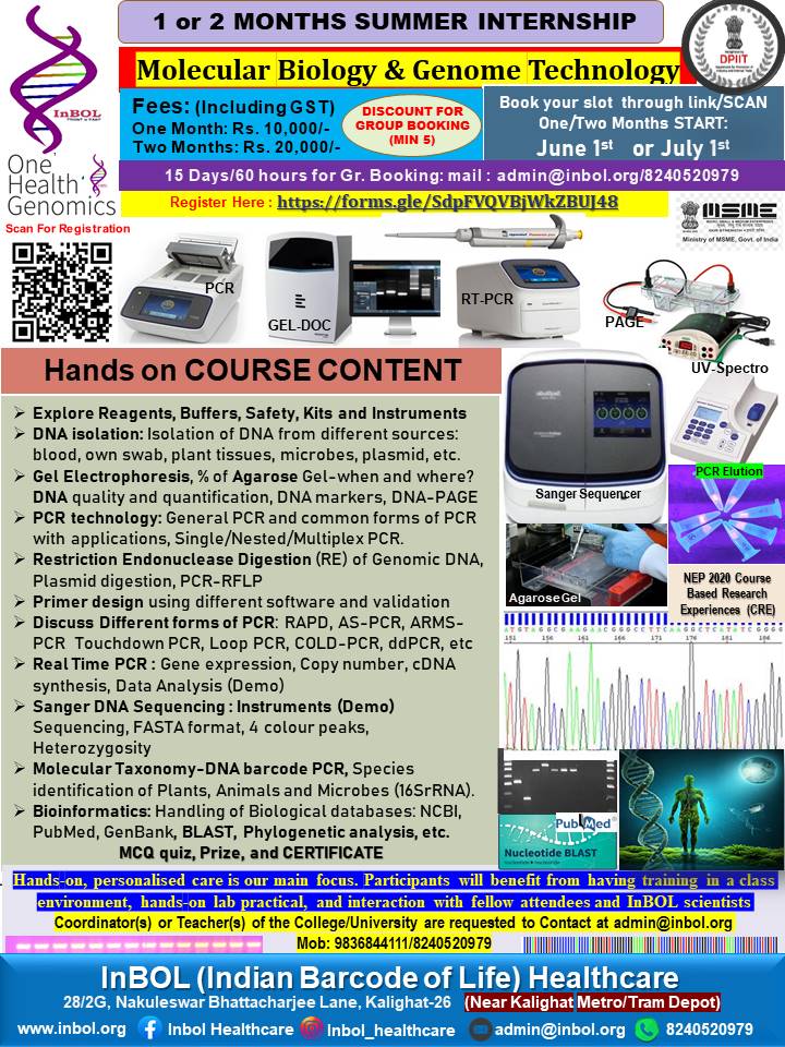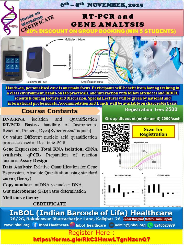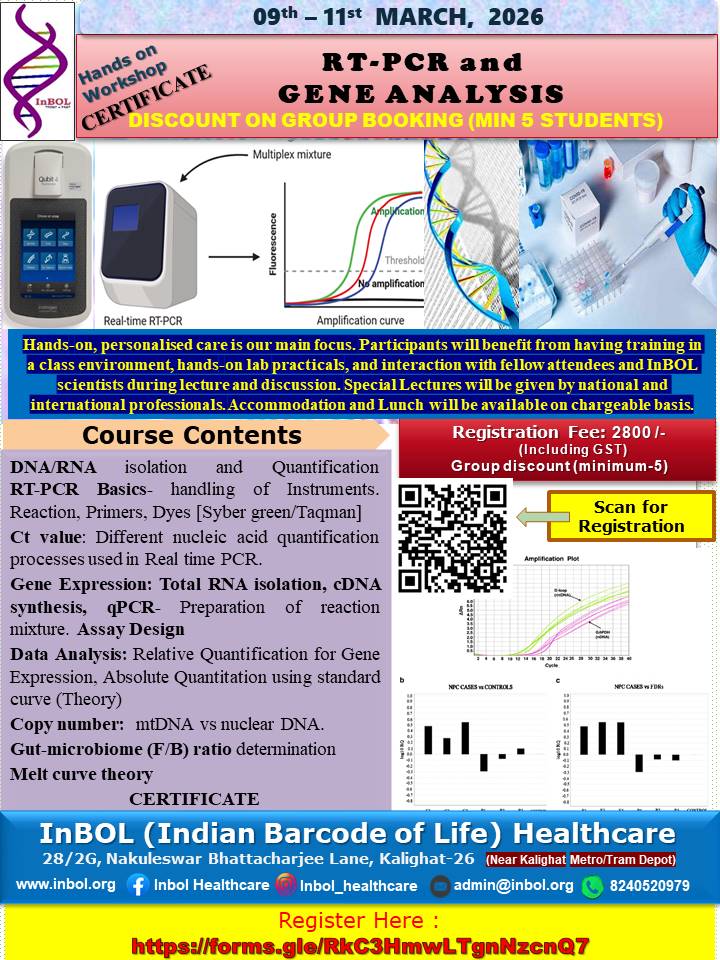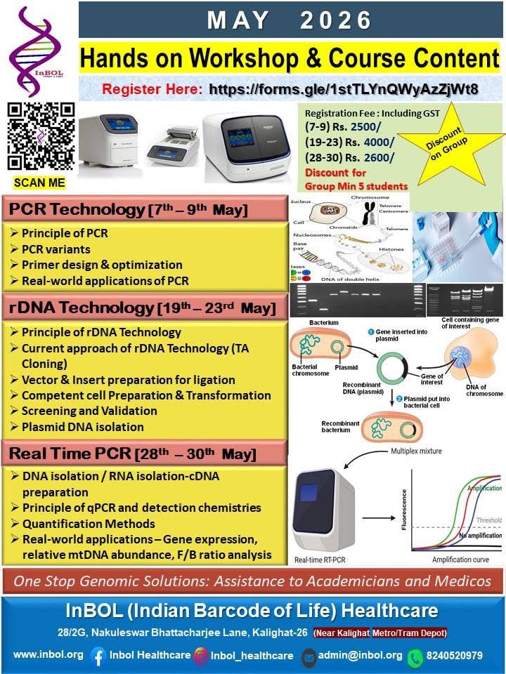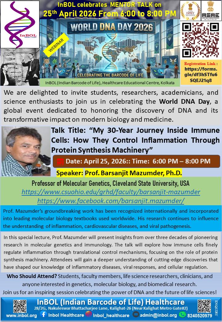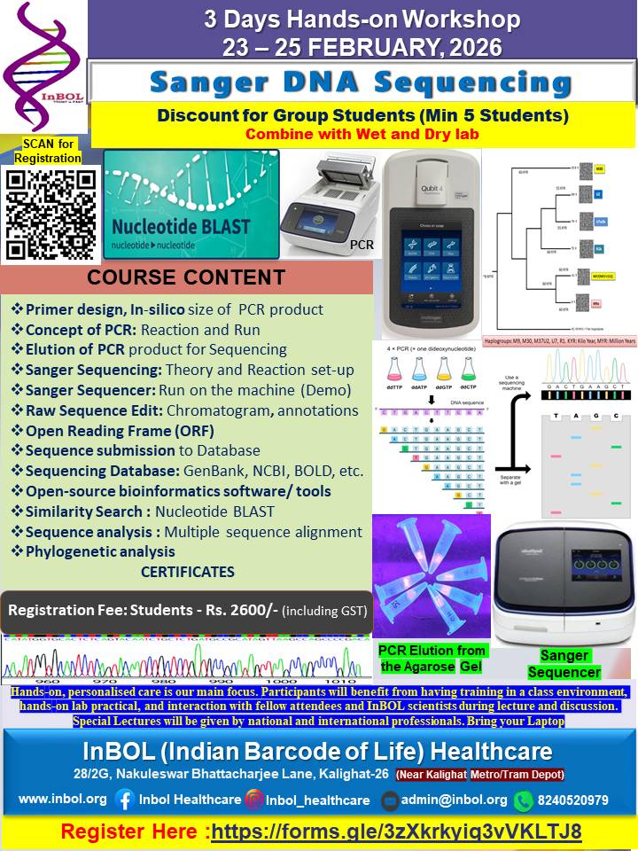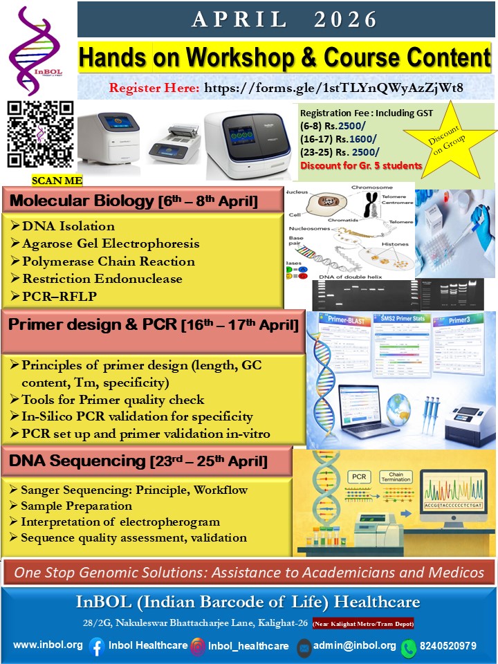 InBOL has since its inception focused on the A,T,G,C of life, dedicating its intellectual and state-of-the-art resources to one health genomics, precision medicine, drug repurposing, non-invasive parental testing, DNA QR code technology for food and bioresource safety and authentication research and developing real life application. With a clear translational vision InBOL aims to contribute in the fulfillment of One Health Mission.
